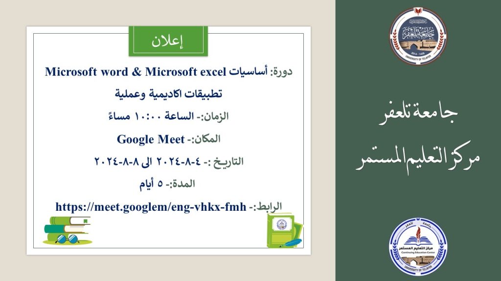 يعلن مركز التعليم المستمر في جامعة تلعفر عن إقامة دورة الكترونية بعنوان ( أساسيات Microsoft word & Microsoft excel: تطبيقات اكاديمية وعملية )